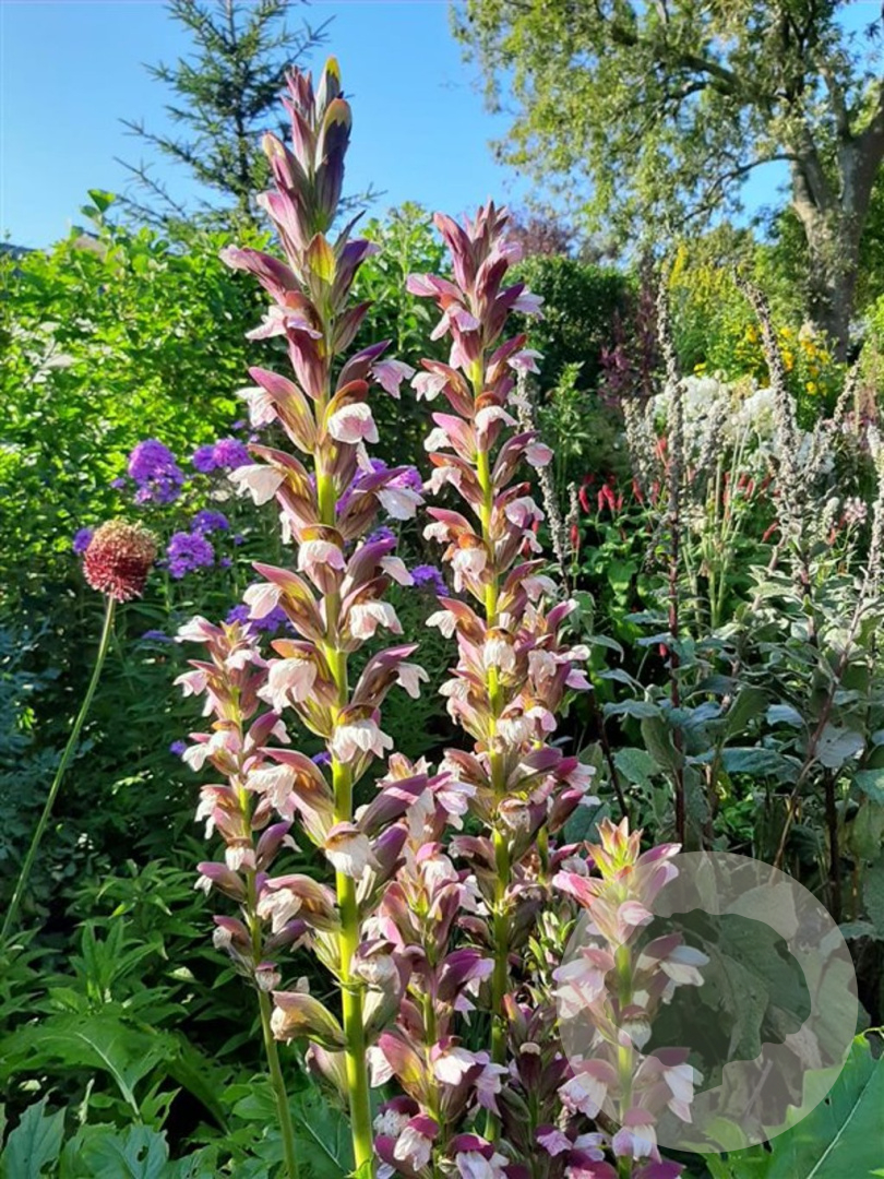 | Toelichting | Acanthus mollis, ook wel bekend als Bears Breeches, is een prachtige vaste plant met paarse en witte bloemen. Deze plant bloeit van juni tot augustus en gedijt goed in zonnige tot halfschaduwrijke plekken met lichte klei, neutrale of voedselrijke grond. De volwassen hoogte is tussen de 100 en 150 cm. |