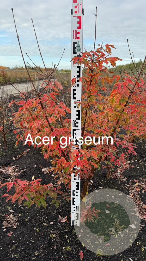 | Toelichting | De Acer griseum, ook wel bekend als de Papieresdoorn, is een prachtige sierlijke boom met groen blad en gele bloemen in april - mei. Deze boom gedijt goed in zon en halfschaduw op zandgrond, lichte klei of neutrale grond. Bereikt een hoogte van 600 cm. |