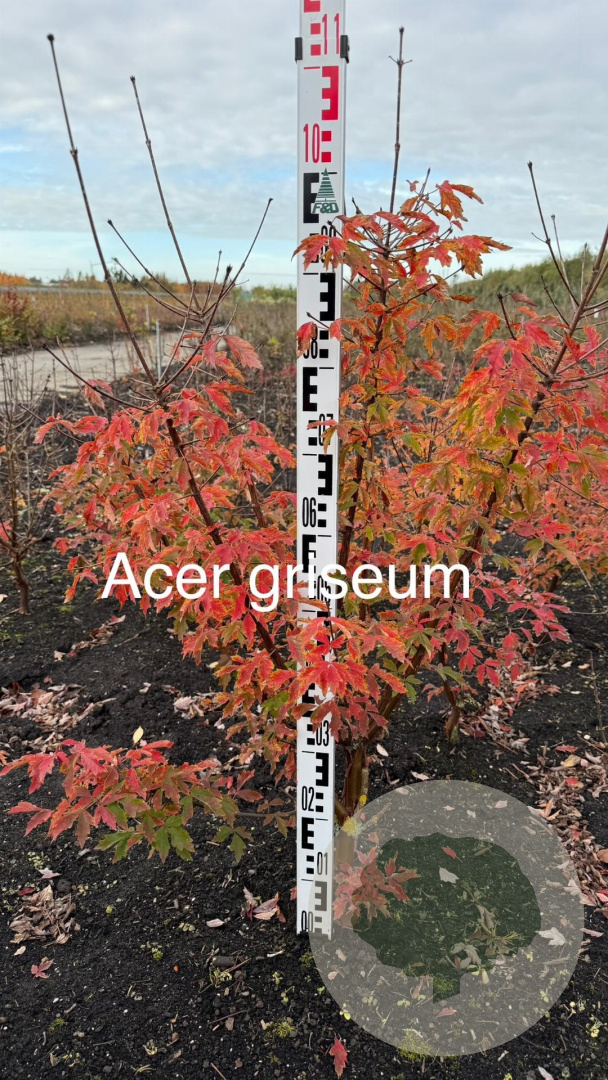 | Toelichting | De Acer griseum, ook wel bekend als de Papieresdoorn, is een prachtige sierlijke boom met groen blad en gele bloemen in april - mei. Deze boom gedijt goed in zon en halfschaduw op zandgrond, lichte klei of neutrale grond. Bereikt een hoogte van 600 cm. |