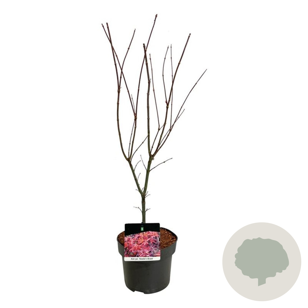 | Toelichting | De Japanse esdoorn (Acer palmatum) 'Skeeter's Broom' is een compacte struik met groen blad en een volwassen hoogte van 150 cm. De bloeiperiode is in april-mei en de plant gedijt goed in zon en halfschaduw op zandgrond, lichte klei of neutrale grond. |