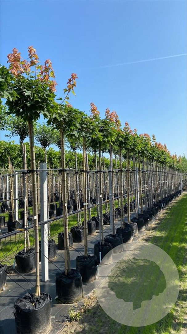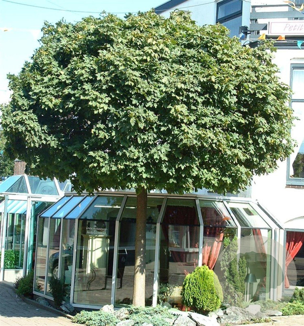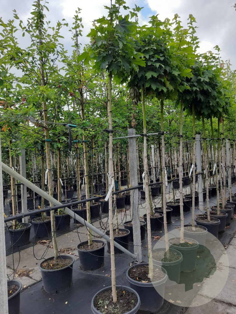 Acer platanoides 'Globosum' (bolesdoorn) kopen? Hoogstam bolboom 10-12 cm stamomtrek, containergekweekt. Compacte ronde kroon, sterk en onderhoudsarm, goudgele herfstkleur, ideaal voor tuinen en straten.