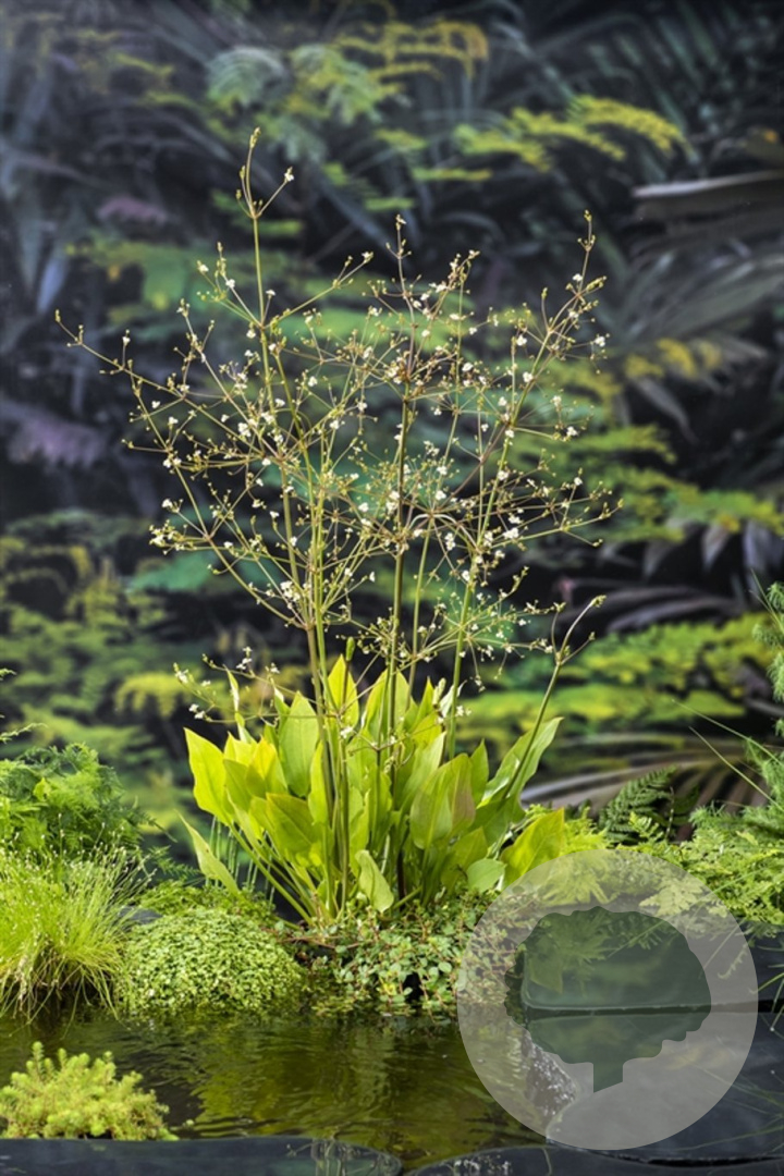 | Toelichting | De Grote waterweegbree is een inheemse plant met witte bloemen en groen blad. Deze plant bloeit van juni tot augustus en gedijt goed in zonnige tot halfschaduwrijke omgevingen op zand- of lemige grond. |