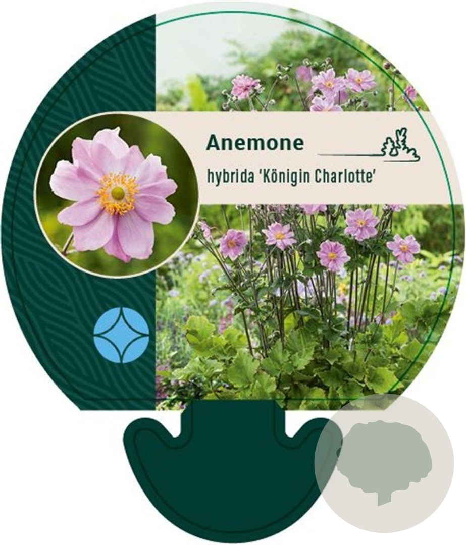 | Toelichting | De Herfstanemoon (Anemone hyb. 'Königin Charlotte') is een prachtige vaste plant met roze bloemen die bloeien van augustus tot oktober. Deze plant gedijt goed in zon en halfschaduw op lichte klei, neutrale of voedselrijke grond. Bereikt een hoogte van 80 cm. |