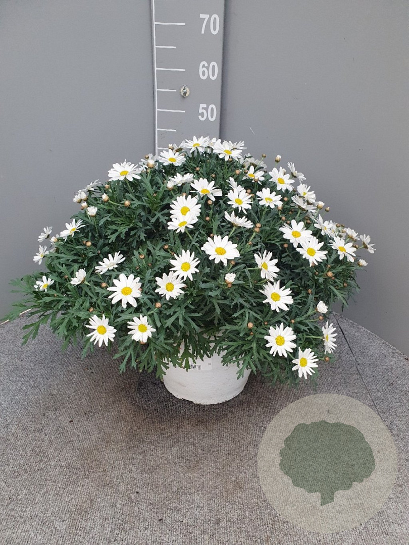 ToelichtingDe Canarische margriet (Argyranthemum frutescens) is een prachtige bloeiende plant met witte, gele of roze bloemen. Deze plant bloeit van mei tot september en gedijt goed in zonnige tot halfschaduwrijke omgevingen met neutrale tot zanderige grond.
