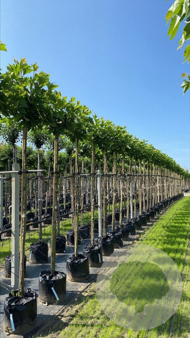 Platanus hispanica 'Alphen's Globe' (plataan 'Alphen's Globe') kopen? Hoogstam bolboom 10-12 cm stamomtrek, containergekweekt. Compacte ronde kroon, groot blad, onderhoudsarm en winterhard.