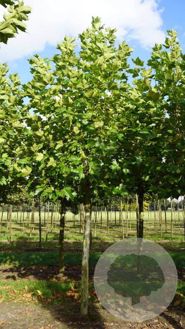 Platanus hispanica (gewone plataan) kopen? Hoogstam solitairboom 18-20 cm stamomtrek, geleverd met draadkluit. Snelgroeiende boom met brede kroon en decoratieve bast, ideaal voor stad en park.