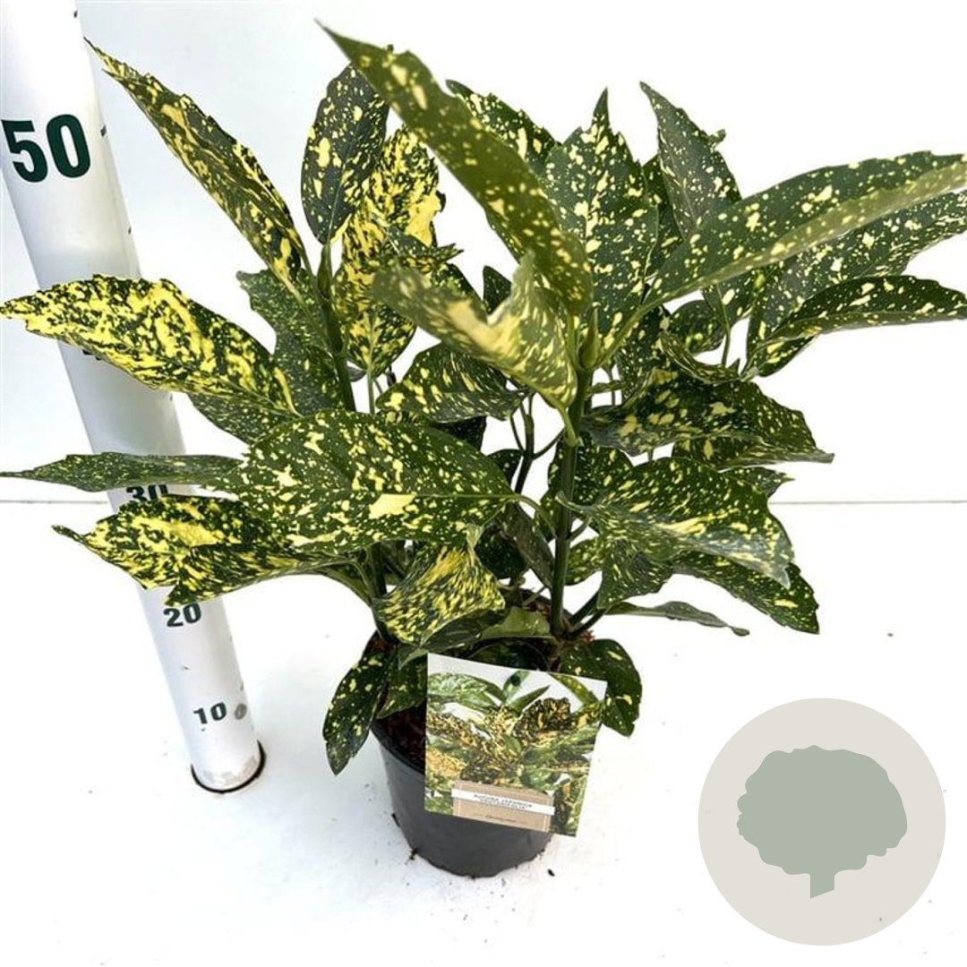 | Toelichting | Aucuba, met zijn opvallende groene bladeren en paarse bloemen in april en mei, gedijt het best in halfschaduw op zure en humusrijke grond. Deze struik kan een hoogte bereiken van 150 cm en voegt kleur toe aan elke tuin. |
