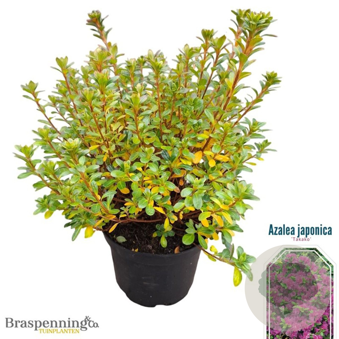 | Toelichting | Azalea 'Takako' is een prachtige struik met roze bloemen en groen blad. Deze azalea bloeit in april en mei en gedijt het beste in halfschaduw op zure en humusrijke grond. De volwassen hoogte is ongeveer 100 cm. |