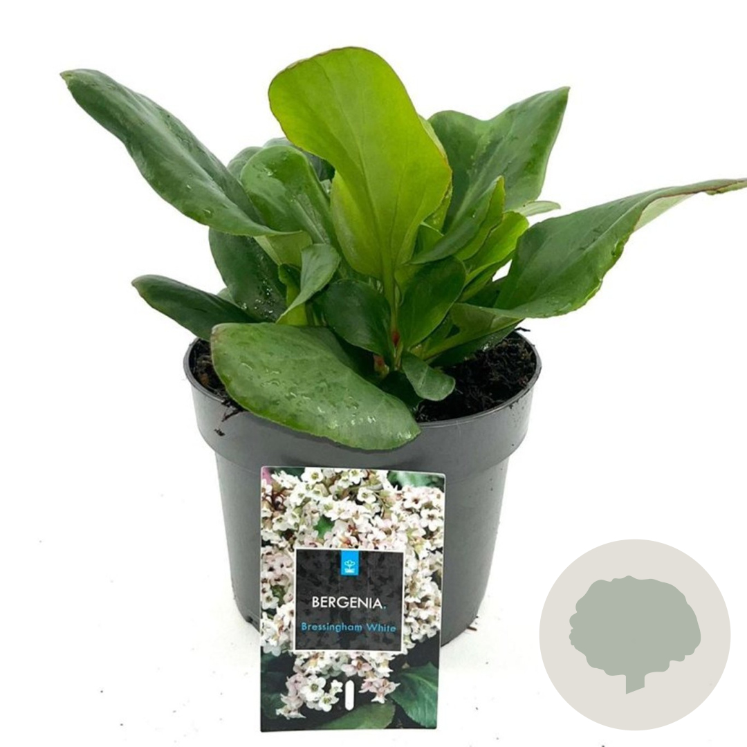 Toelichting | De Schoenlappersplant, Bergenia 'Bressingham White', is een prachtige vaste plant met witte bloemen en groen blad. Deze plant bloeit in april en mei en gedijt goed in zon en halfschaduw op zure, humusrijke grond. Perfect voor een tuinborder of rotstuin. |