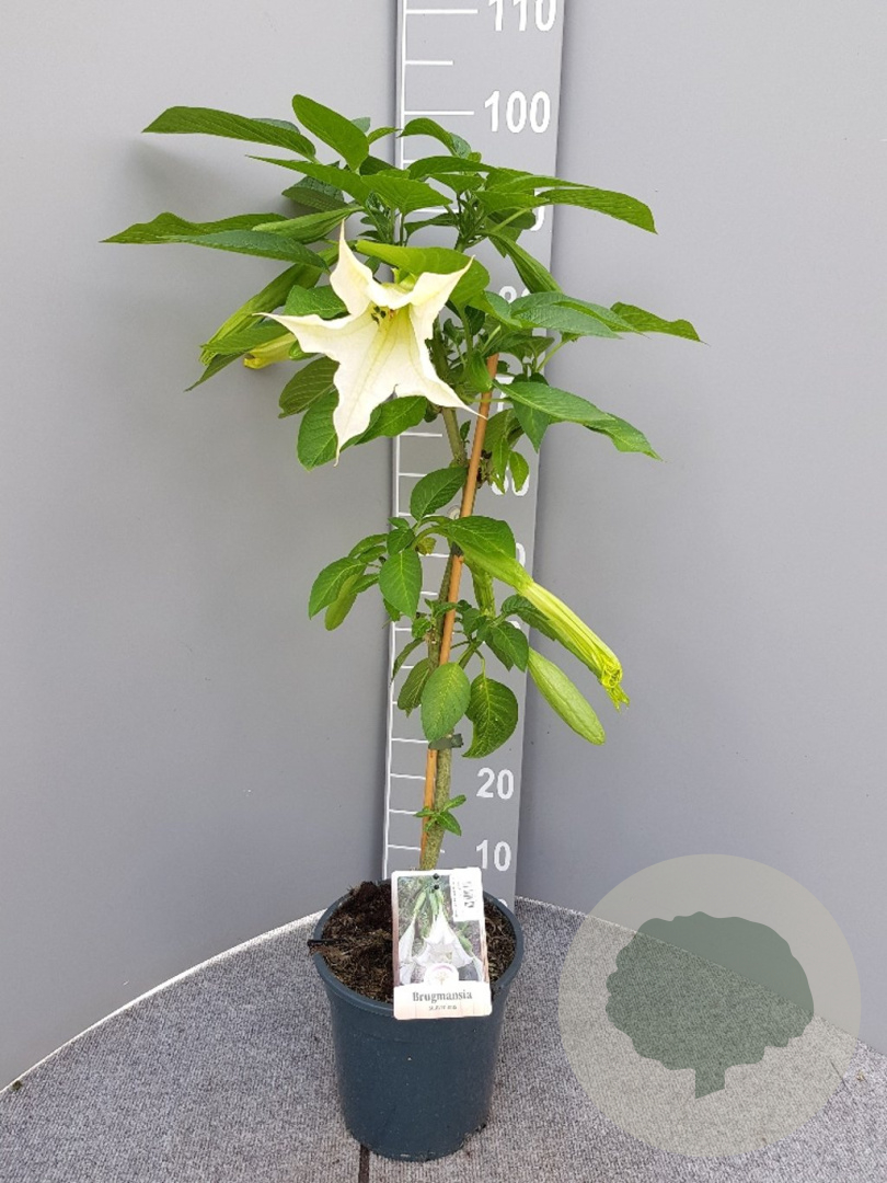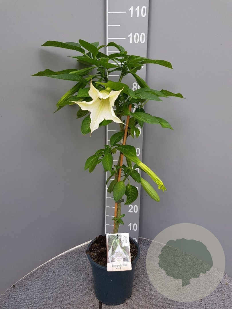 | Toelichting | De Brugmansia suaveolens, ook wel bekend als de Engelentrompet, is een prachtige plant met grote, hangende bloemen in de kleuren wit en geel. Deze plant bloeit van juni tot oktober en gedijt het beste in de volle zon op neutrale, voedselrijke en humusrijke grond. |