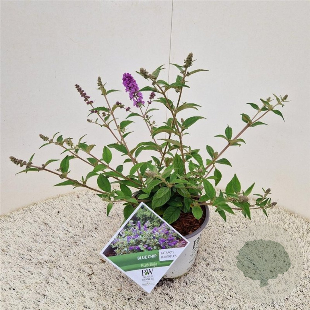 Toelichting | De Vlinderstruik 'Blue Chip' is een compacte struik met paarse bloemen die vlinders aantrekken. Hij bloeit van juli tot september en gedijt het beste in zonnige standplaatsen met goede tuingrond. Perfect voor tuinen met beperkte ruimte. |
