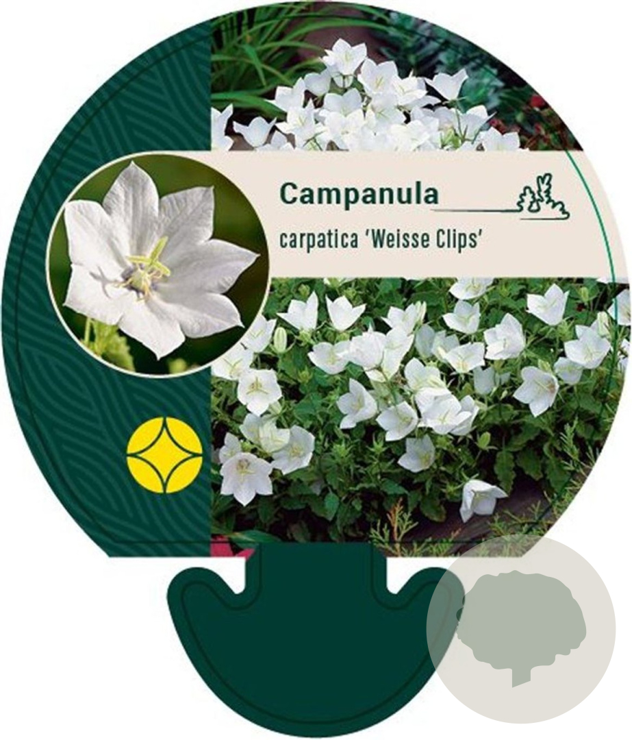 | Toelichting | De Klokjesbloem 'Weisse Clips' is een compacte plant met witte klokvormige bloemen. Deze bloeien van juni tot augustus en staan graag in de zon of halfschaduw. Perfect voor lichte klei en neutrale grond in de tuin. |