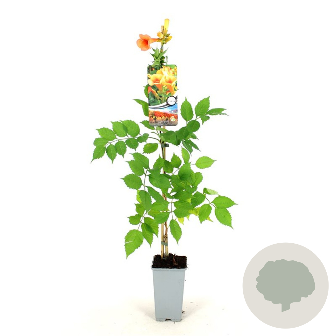 | Toelichting | De Trompetklimmer is een prachtige klimplant met grote oranje trompetvormige bloemen die bloeien van juli tot september. Deze plant gedijt het beste in de volle zon en is ideaal voor goede tuingrond of humusrijke grond. |