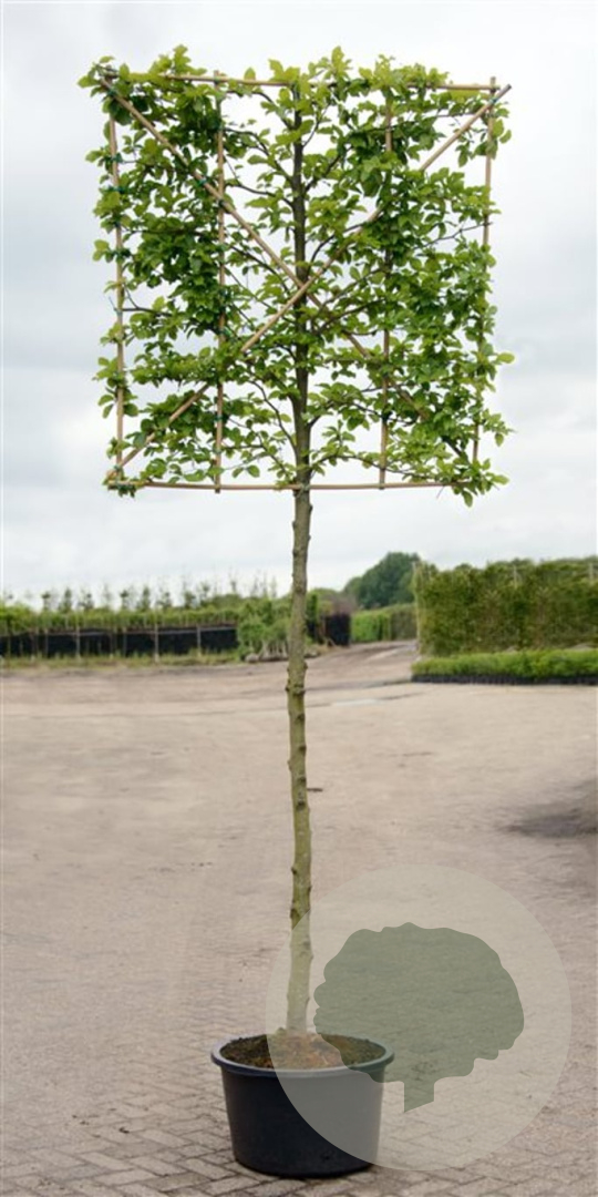 Carpinus betulus (gewone haagbeuk) leiboom kopen? Hoogstam 10–12 cm stamomtrek, stam 180 cm, rek 150×150 cm, containergekweekt. Sterke, inheemse leiboom voor groene erfafscheiding.