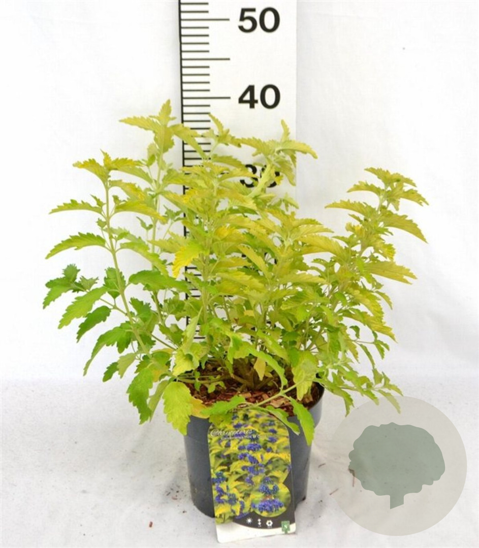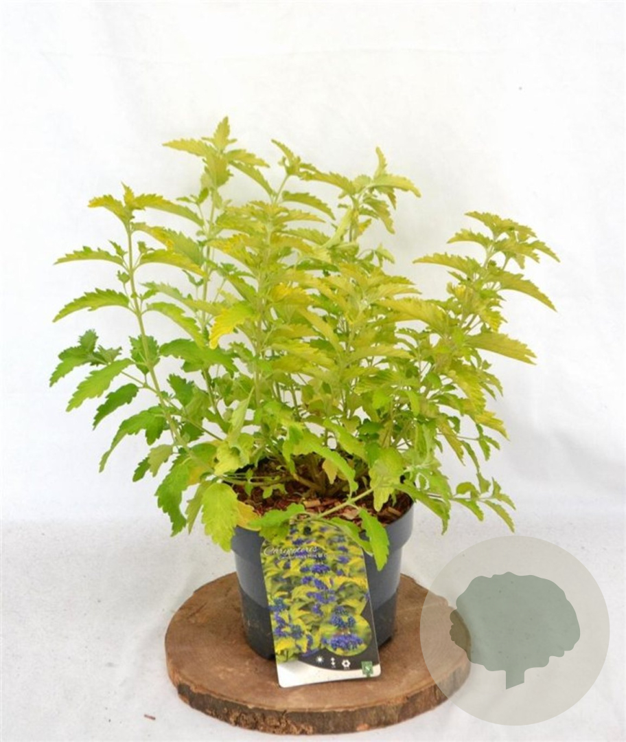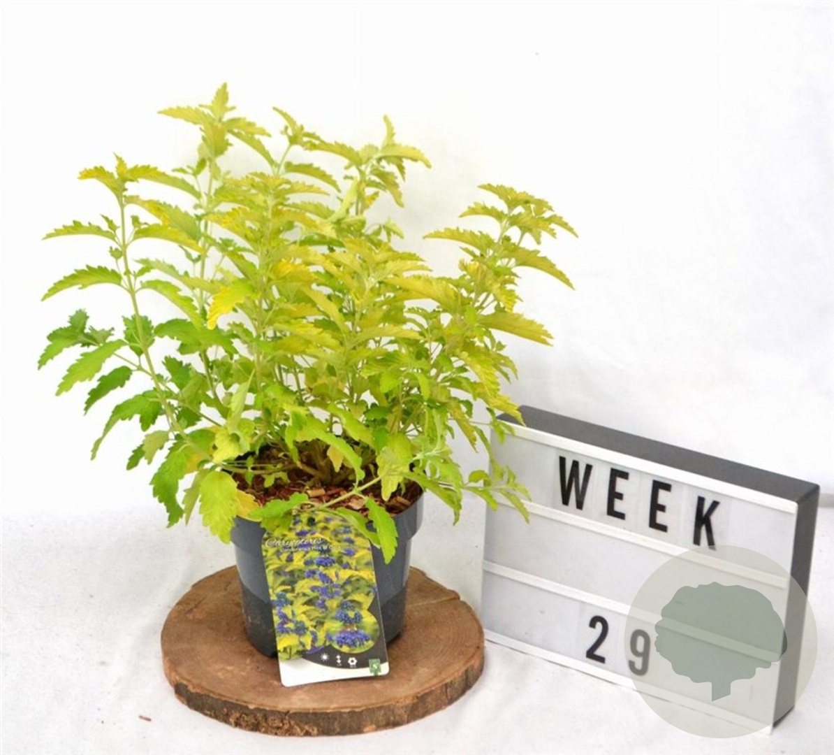 | Toelichting | De Caryopteris cland. Hint of Gold, ook wel bekend als Blauwe spirea, is een prachtige struik met blauwe bloemen en geel blad. Deze plant bloeit van juli tot september en gedijt het beste in de volle zon op zand- of neutrale grond. |