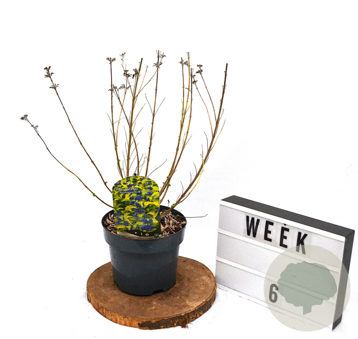 | Toelichting | De Caryopteris cland. Hint of Gold, ook wel bekend als Blauwe spirea, is een prachtige struik met blauwe bloemen en geel blad. Deze plant bloeit van juli tot september en gedijt het beste in de volle zon op zand- of neutrale grond. |