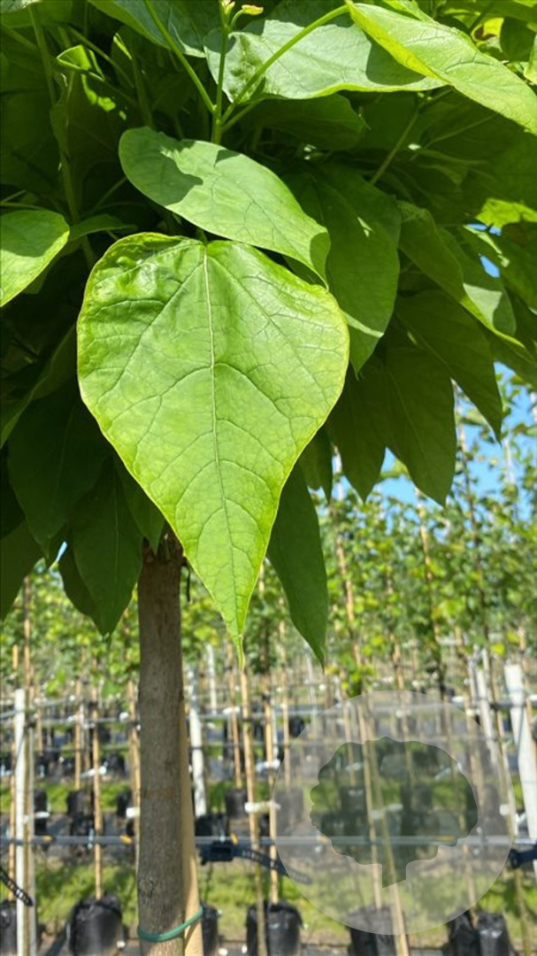 Catalpa bignonioides 'Nana' (boltrompetboom) kopen? Hoogstam bolboom 12-14 cm stamomtrek, containergekweekt. Compacte bolvormige kroon, groot blad, onderhoudsarm en winterhard. Perfect voor tuinen en straten.