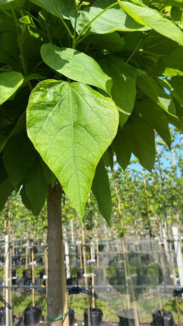 Catalpa bignonioides 'Nana' (boltrompetboom) kopen? Hoogstam bolboom 12-14 cm stamomtrek, containergekweekt. Compacte bolvormige kroon, groot blad, onderhoudsarm en winterhard. Perfect voor tuinen en straten.