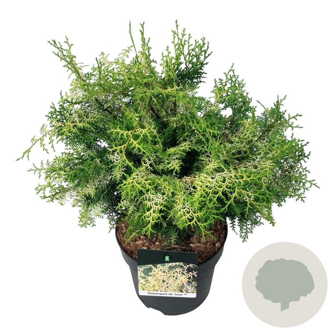 | Toelichting | De Fijnbladige cipres (Chamaecyparis o. 'Lucas') is een prachtige groenblijvende conifeer met fijn blad. Deze cipres kan een hoogte bereiken van 200 cm en gedijt goed in zonnige tot halfschaduwrijke omgevingen met neutrale grond. Perfect voor een groene touch in de tuin. |