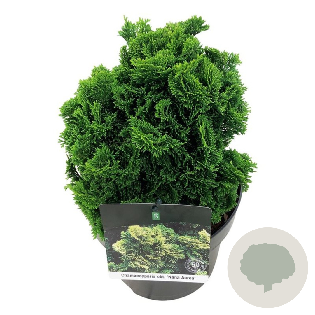 | Toelichting | De Dwergcipres (Chamaecyparis o. 'Nana Aurea') is een langzaam groeiende conifeer met opvallend geel blad. Deze plant gedijt goed in zowel zon als halfschaduw op zandgrond, klei of neutrale grond. Perfect voor een kleurrijke toevoeging aan je tuin! |