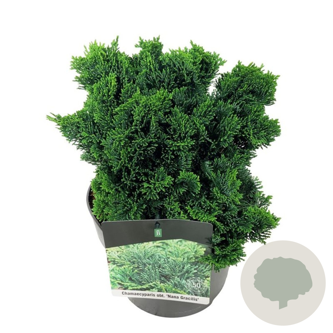 | Toelichting | De Dwergcipres (Chamaecyparis o. 'Nana Gracilis') is een compacte conifeer met groene bladeren. Deze plant gedijt goed in zon en halfschaduw op zandgrond, lichte klei of neutrale grond. De volwassen hoogte is ongeveer 150 cm. |