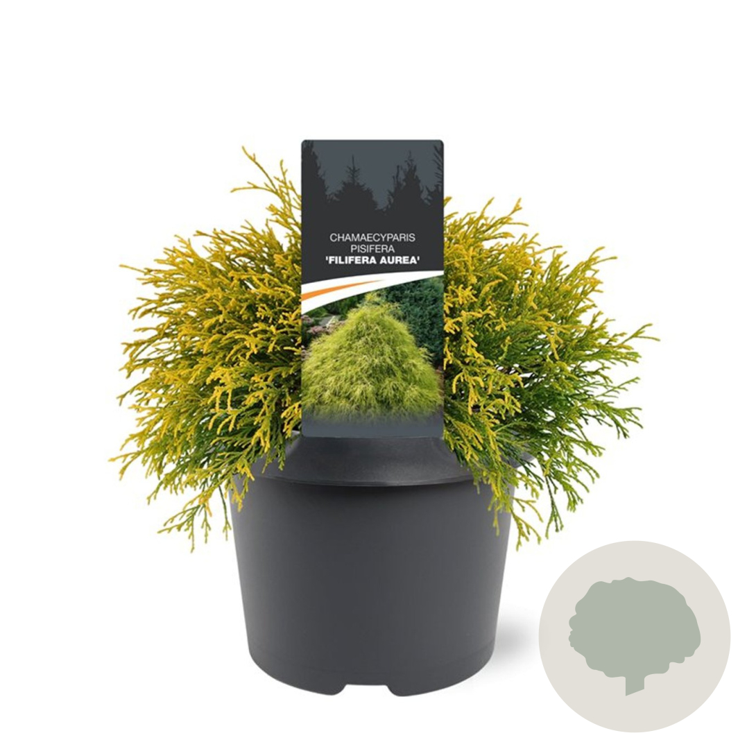 | Toelichting | De Gele treurcipres (Chamaecyparis p. 'Filifera Aurea') is een prachtige conifeer met geel loof. Deze boom kan een volwassen hoogte van 300 cm bereiken en gedijt goed in zonnige tot halfschaduwrijke omgevingen op neutrale grond. Perfect voor een kleurrijke toevoeging aan de tuin. |