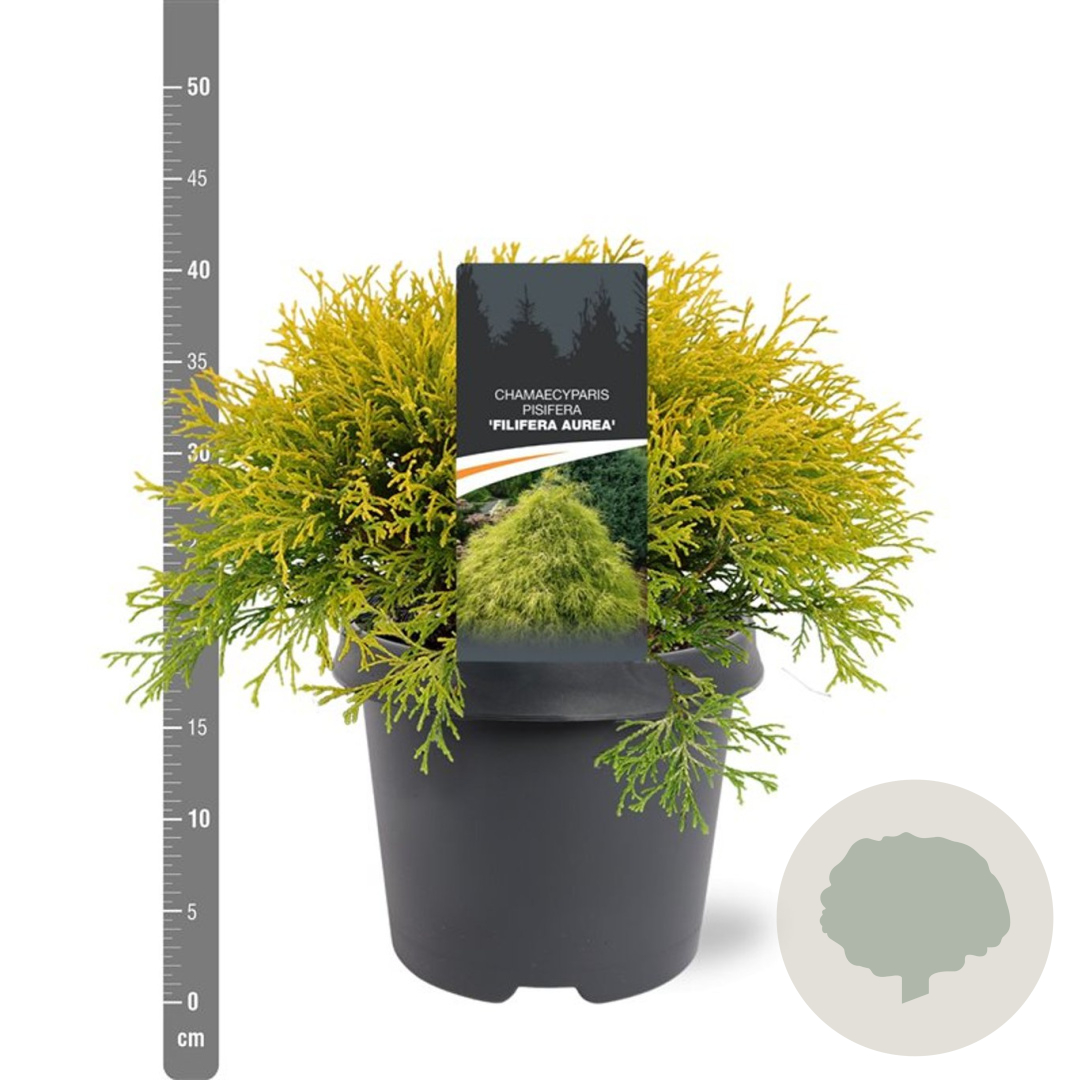 | Toelichting | De Gele treurcipres (Chamaecyparis p. 'Filifera Aurea') is een prachtige conifeer met geel loof. Deze boom kan een volwassen hoogte van 300 cm bereiken en gedijt goed in zonnige tot halfschaduwrijke omgevingen op neutrale grond. Perfect voor een kleurrijke toevoeging aan de tuin. |