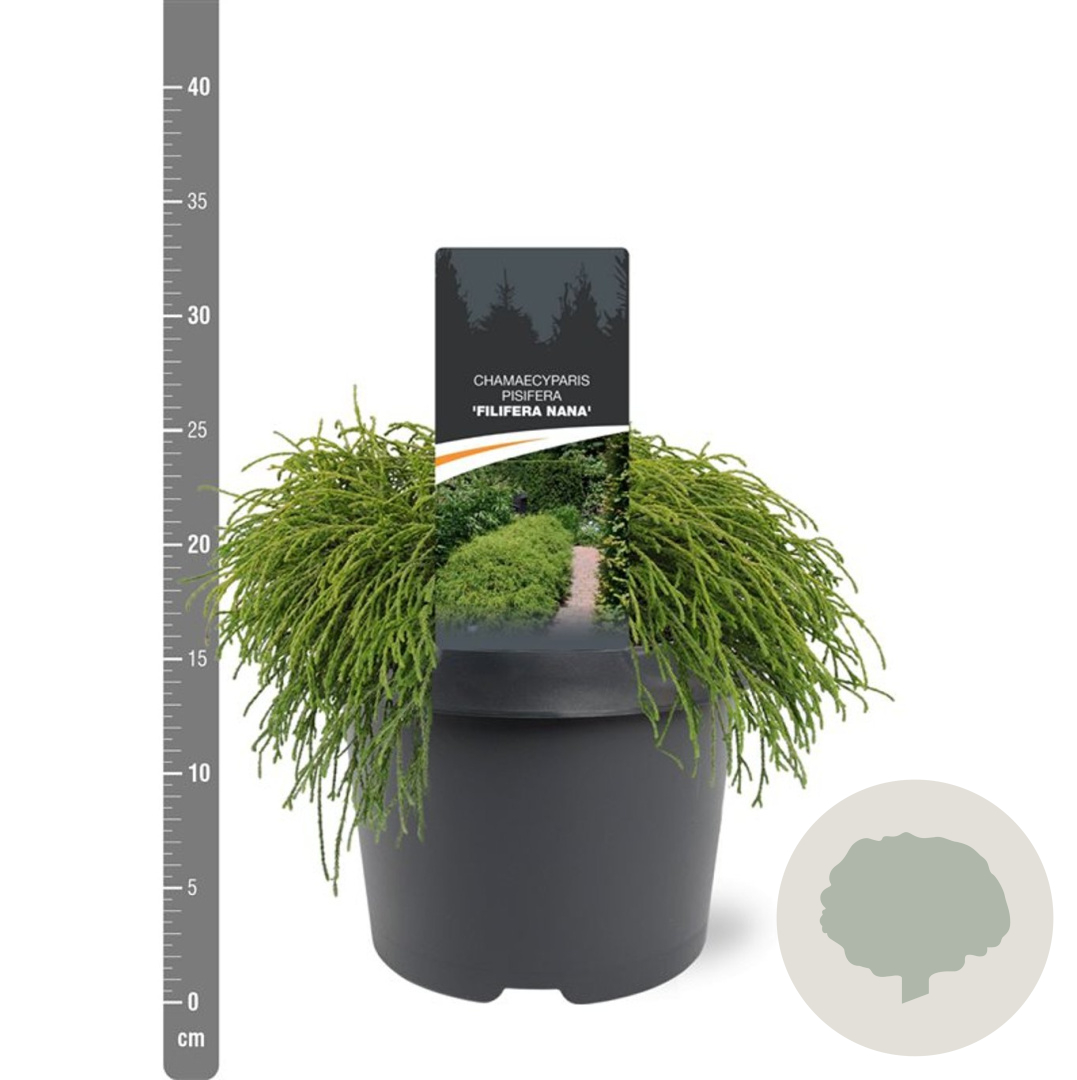 | Toelichting | De Dwergcipres (Chamaecyparis p. 'Filifera Nana') is een compacte conifeer met groen loof. Deze sierlijke plant bereikt een hoogte van 150 cm en gedijt goed in zon en halfschaduw op zandgrond, neutrale grond of goede tuingrond. |