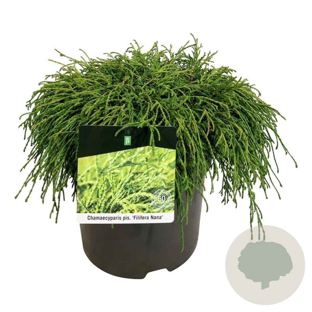 | Toelichting | De Dwergcipres (Chamaecyparis p. 'Filifera Nana') is een compacte conifeer met groen loof. Deze sierlijke plant bereikt een hoogte van 150 cm en gedijt goed in zon en halfschaduw op zandgrond, neutrale grond of goede tuingrond. |