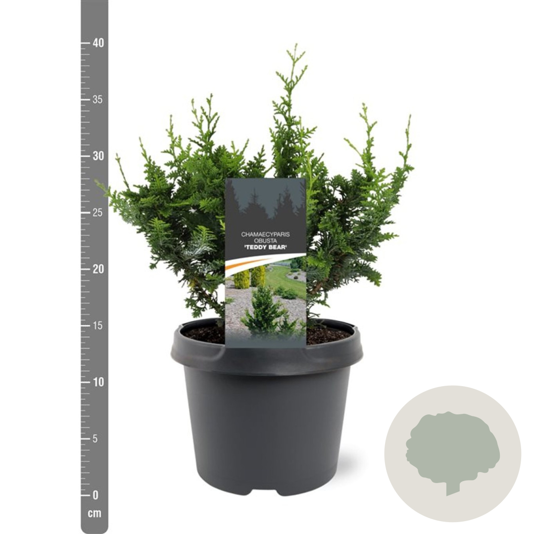 | Toelichting | De Dwergcipres 'Teddy Bear' is een compacte conifeer met groen blad. Deze cipres bereikt een hoogte van ongeveer 150 cm en gedijt goed in zonnige tot halfschaduwrijke standplaatsen op zandgrond, lichte klei of neutrale grond. |