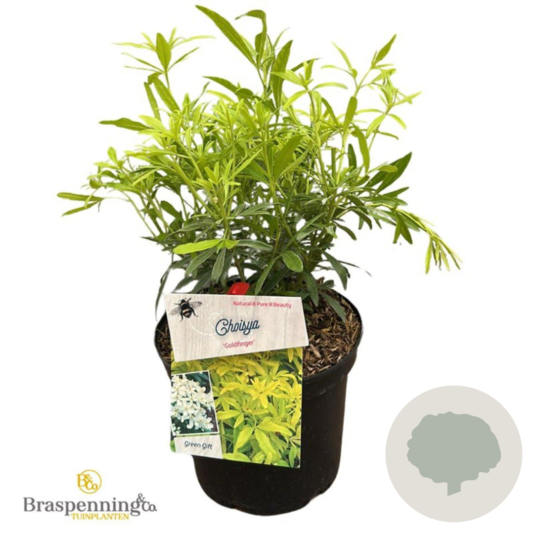 | Toelichting | De Goudvingerstruik (Choisya Goldfingers) is een prachtige sierheester met goudgele bladeren en witte bloemen in de lente en herfst. Deze struik bereikt een hoogte van 100 cm en gedijt het beste in zon tot halfschaduw op neutrale, goede tuingrond. |