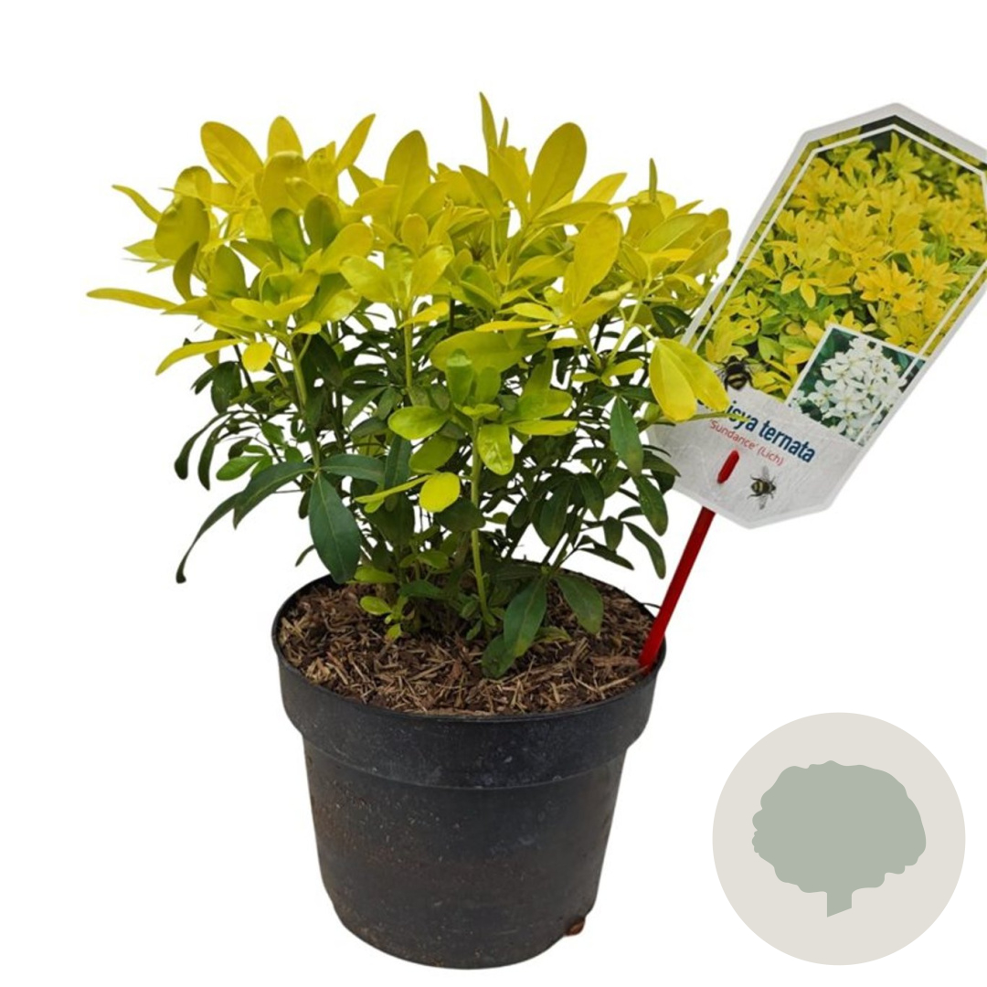 | Toelichting | De Goudglansmispel Sundance is een prachtige struik met opvallend geel blad en witte bloemen in de periode mei - juni en september. Deze plant gedijt goed in zonnige tot halfschaduwrijke plekken met lichte klei en neutrale grond. Een echte eyecatcher in de tuin! |