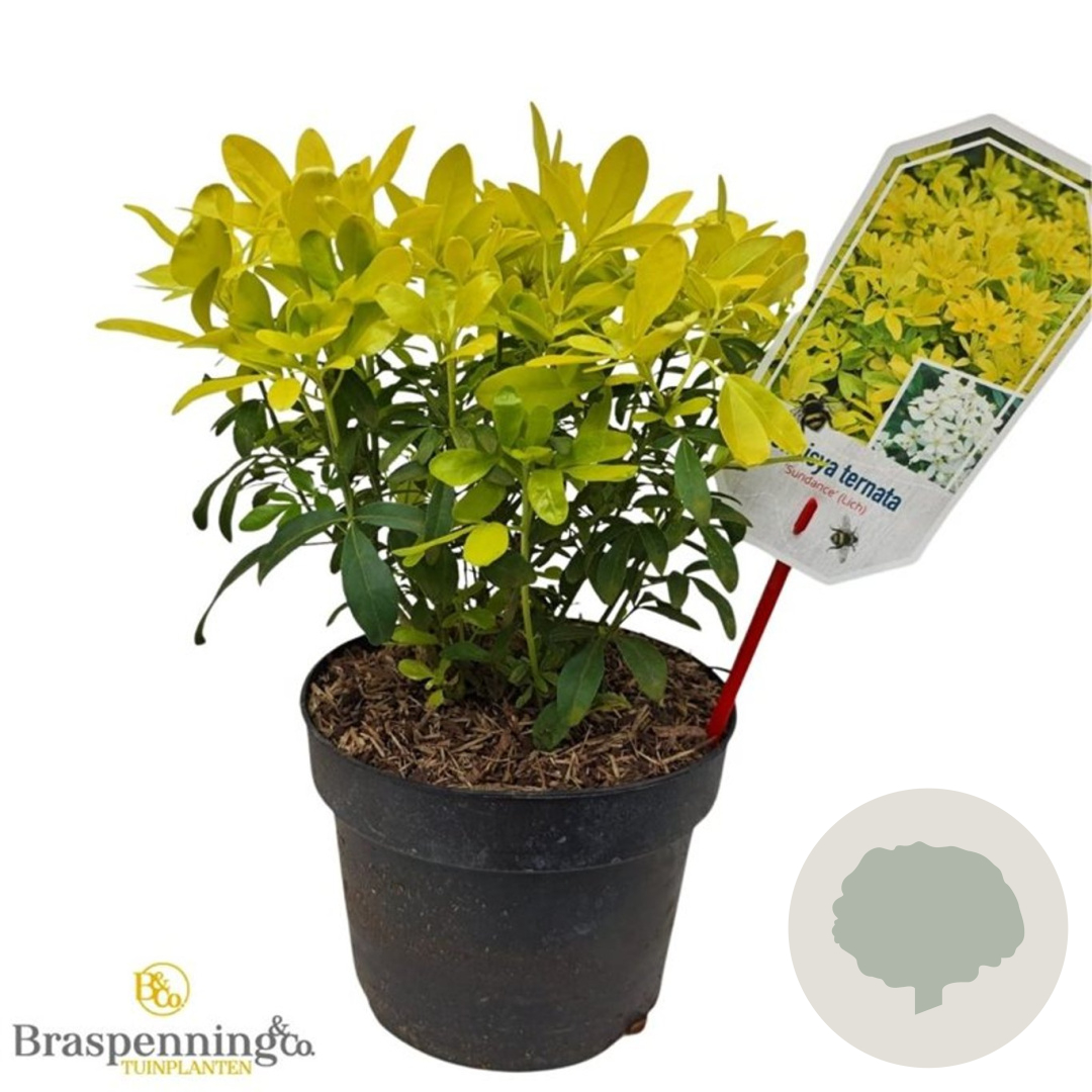 | Toelichting | De Goudglansmispel Sundance is een prachtige struik met opvallend geel blad en witte bloemen in de periode mei - juni en september. Deze plant gedijt goed in zonnige tot halfschaduwrijke plekken met lichte klei en neutrale grond. Een echte eyecatcher in de tuin! |