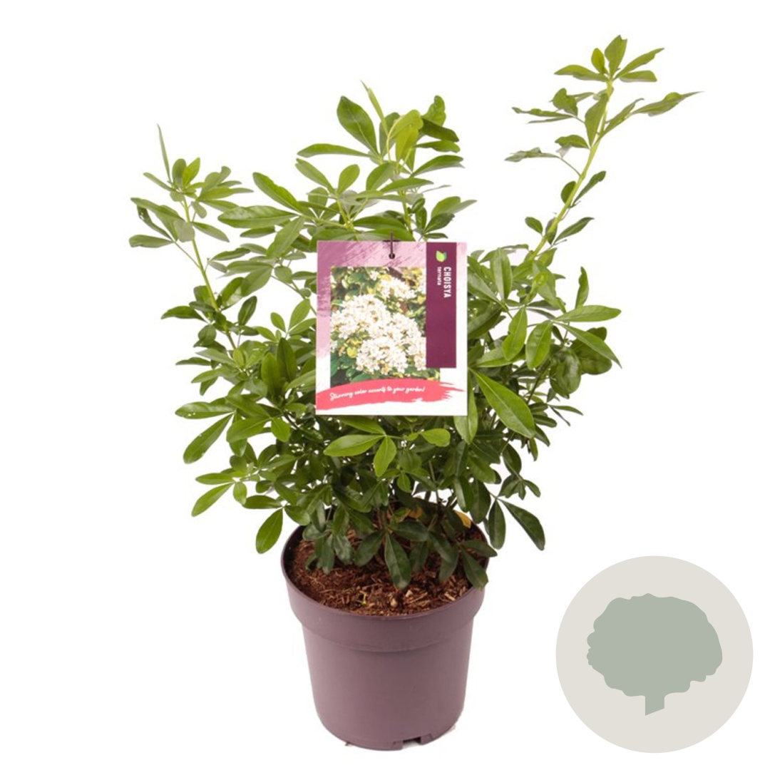 | Toelichting | De Choisya ternata, ook wel bekend als de Mexicaanse oranjebloesem, is een prachtige groenblijvende struik met witte bloemen. Deze plant bloeit in het voorjaar en herfst en gedijt goed in zonnige tot halfschaduwrijke omgevingen op zandgrond, lichte klei of neutrale grond. |