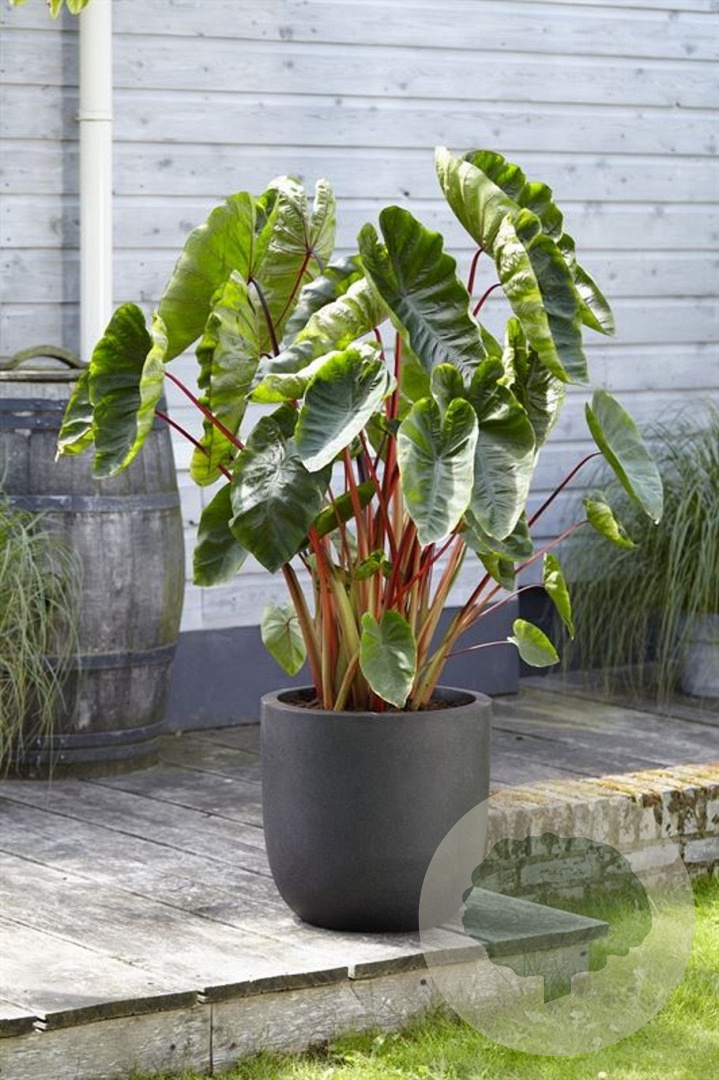 | Toelichting | De Taro (Colocasia esc. 'Hawaiian Punch') is een exotische plant met grote donkergroene bladeren en witte bloemen. Deze plant bloeit van juli tot september en gedijt het beste in zonnige tot halfschaduwrijke gebieden met voedselrijke en humusrijke grond. Bereikt een hoogte van 100-150 cm. |