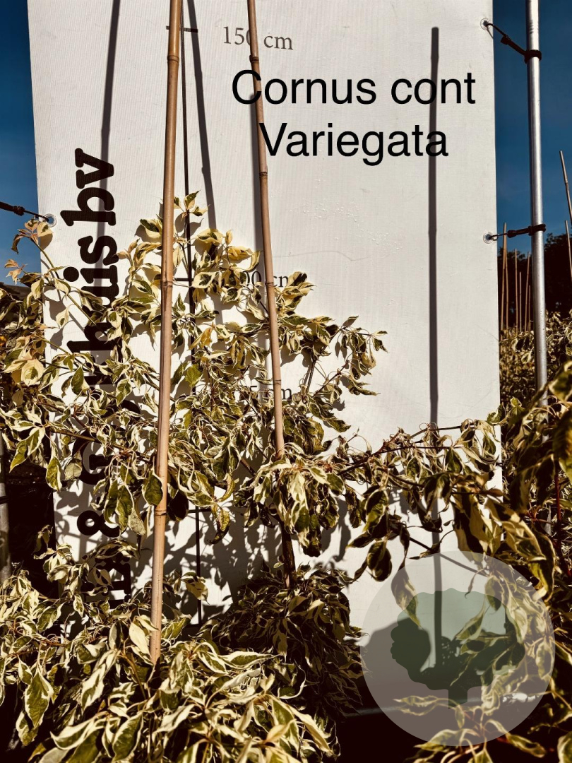 | Toelichting | De Gestreepte kornoelje (Cornus controversa 'Variegata') is een prachtige heester met groen/crème gestreept blad en witte bloemen in mei - juni. Deze plant gedijt goed in zon en halfschaduw op zandgrond, lichte klei of neutrale grond. Bereikt een hoogte van 300 cm. |
