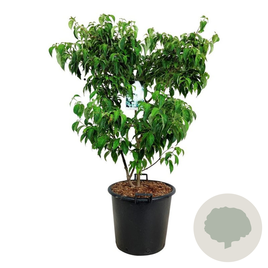 | Toelichting | De Kornoelje 'China Girl' is een prachtige struik met witte bloemen in mei-juni. Het groene blad en compacte formaat maken het een mooie aanvulling voor zowel zonnige als halfschaduwrijke tuinen. Geschikt voor zandgrond, lichte klei en neutrale grond. |