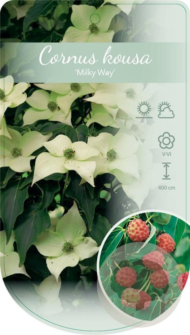 | Toelichting | De Kornoelje 'Milky Way' is een prachtige struik met witte bloemen in mei-juni. De groene bladeren en compacte groei maken het een aanwinst voor elke tuin. Geschikt voor zon en halfschaduw op zandgrond, lichte klei of neutrale grond. |