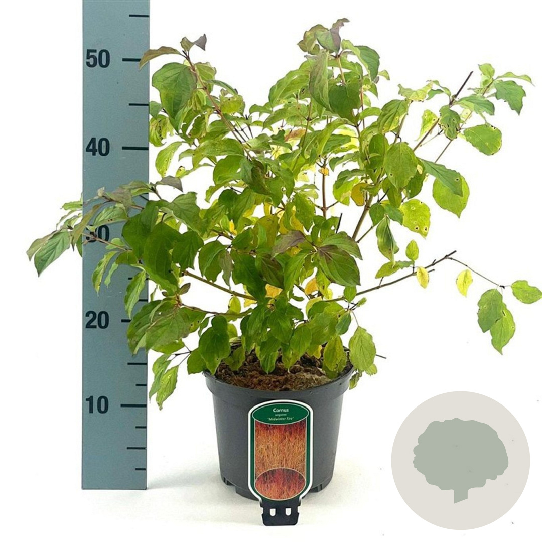 | Toelichting | De Kornoelje 'Midwinter Fire' is een prachtige struik met opvallend gekleurde bladeren in groen, oranje en rood. In mei en juni bloeit deze plant met gele bloemen. Perfect voor zonnige tot halfschaduwrijke plekken in de tuin met zandgrond, lichte klei of neutrale grond. |