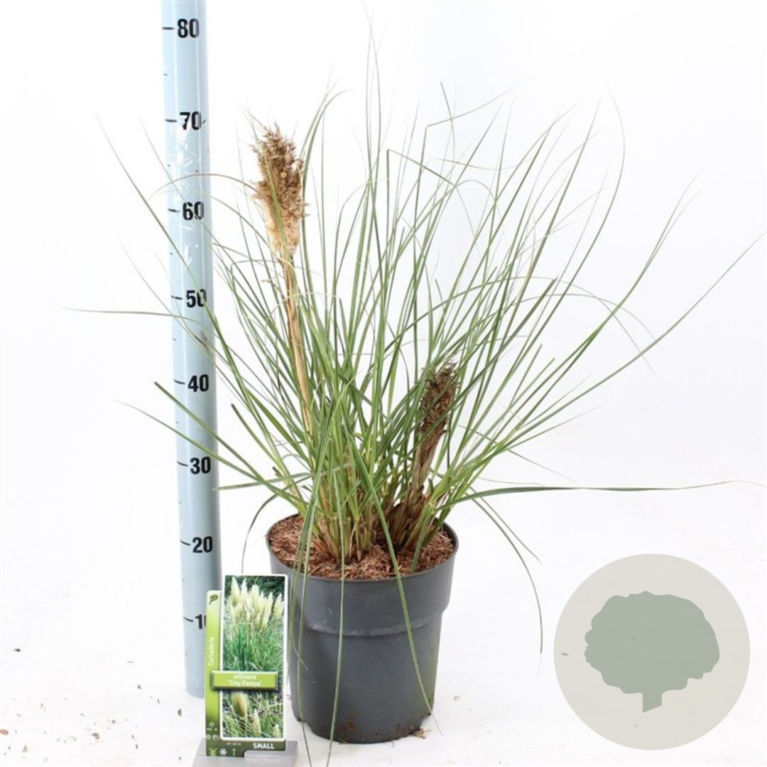 | Toelichting | Pampasgras (Cortaderia s. Tiny Pampa) is een prachtige siergras met witte pluimen die bloeien van augustus tot oktober. Het groeit het beste in de volle zon op zand- of neutrale grond. Ideaal voor een zonnige border of als eyecatcher in de tuin. |