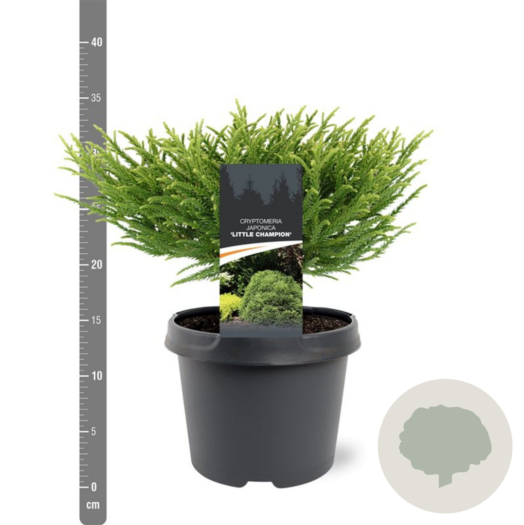 | Toelichting | De Japanse ceder 'Little Champion' is een compacte conifeer met groen loof. Deze plant wordt ongeveer 150 cm hoog en gedijt goed in zonnige tot halfschaduwrijke standplaatsen op zandgrond, lichte klei of neutrale grond. |