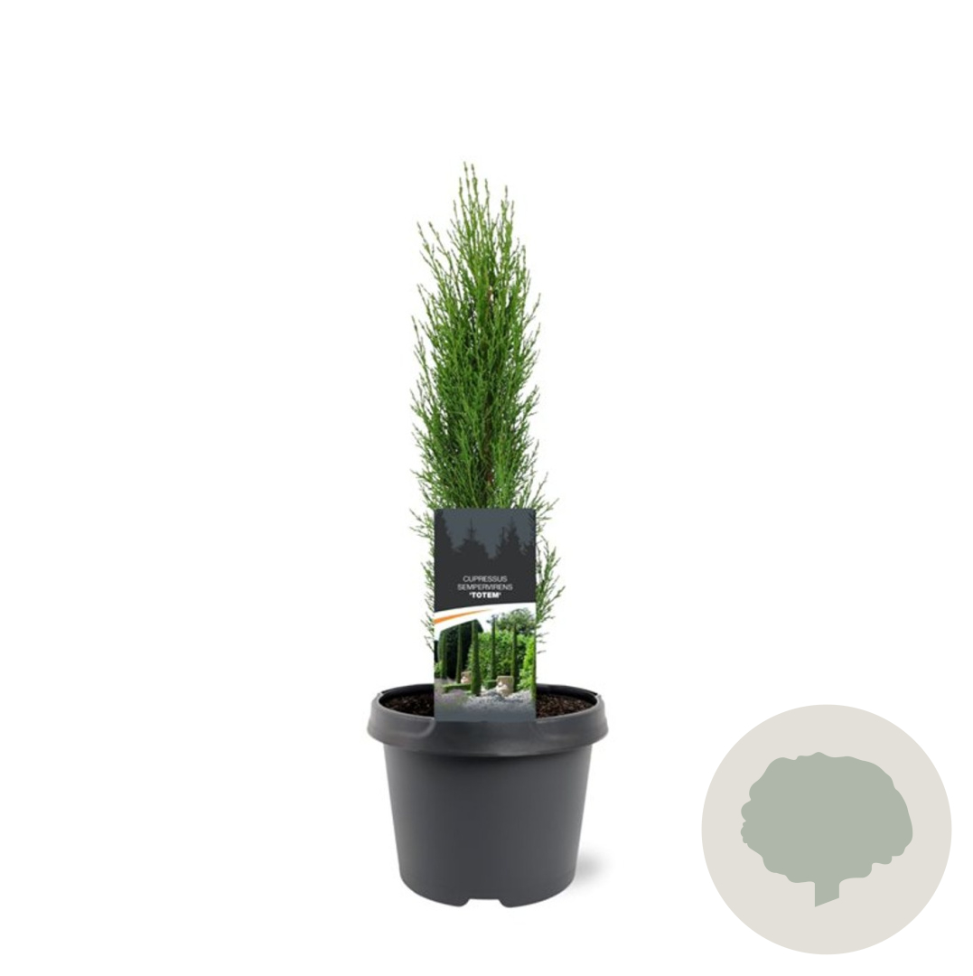 | Toelichting | De Cipres (Cupressus sempervirens 'Totem') is een prachtige groenblijvende conifeer met een volwassen hoogte van 300 cm. Het groene blad zorgt voor een sfeervolle uitstraling in de tuin. Perfect voor een zonnige standplaats op zandgrond, klei of neutrale grond. |