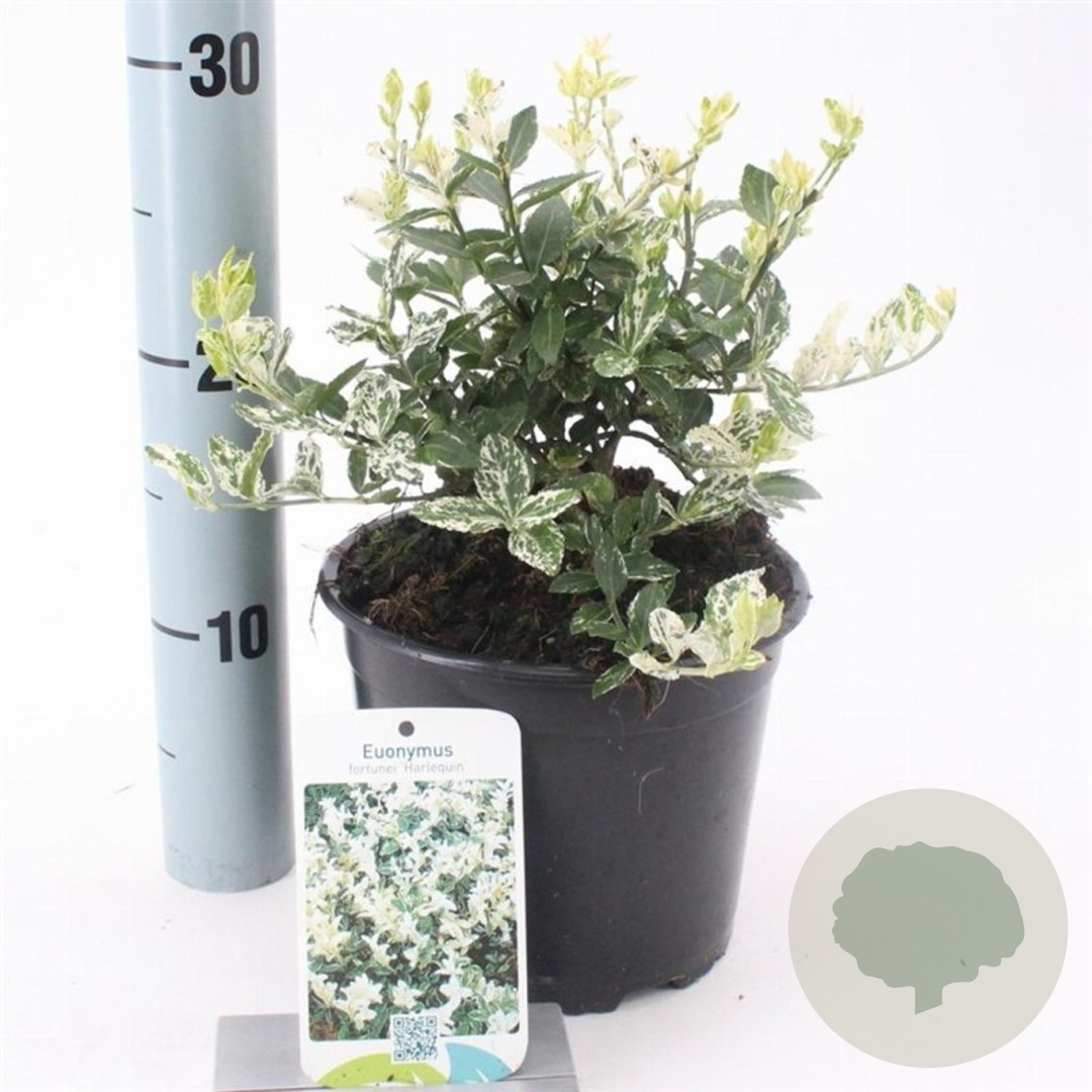 | Toelichting | De Euonymus fort. 'Harlequin', ook wel Kardinaalsmuts genoemd, is een prachtige struik met groen-wit bont blad. In mei-juni bloeit deze plant met groene bloemen. Ideaal voor zon en halfschaduw in neutrale, goede tuingrond met humus. |