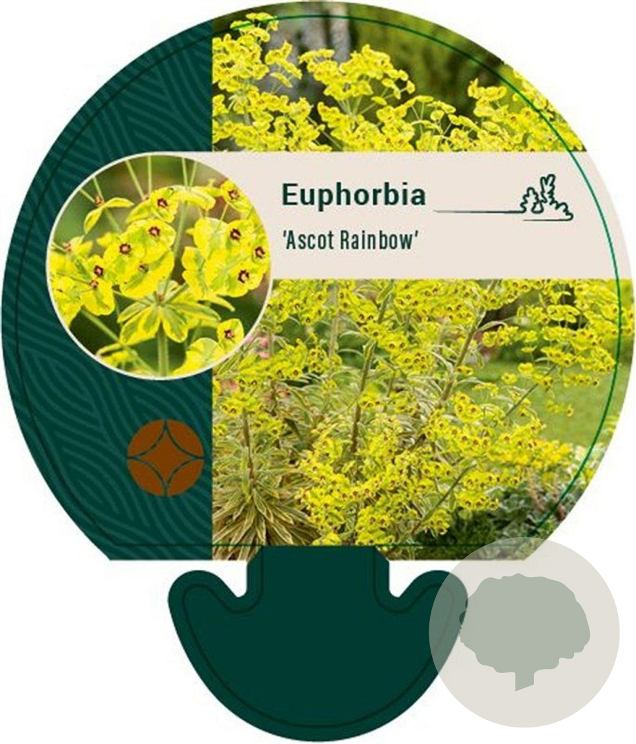 | Toelichting | De Wolfsmelk 'Ascot Rainbow' is een prachtige borderplant met opvallend bont blad in groen, crème en rood. In mei en juni bloeit deze plant met gele bloemen. Perfect voor zonnige tot halfschaduwrijke plekken in neutrale, goede tuingrond met humus. |