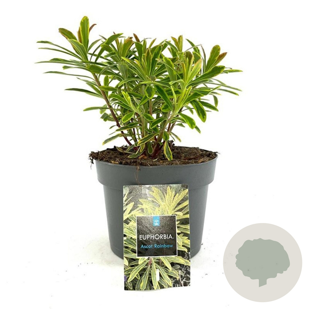 | Toelichting | De Wolfsmelk 'Ascot Rainbow' is een prachtige borderplant met opvallend bont blad in groen, crème en rood. In mei en juni bloeit deze plant met gele bloemen. Perfect voor zonnige tot halfschaduwrijke plekken in neutrale, goede tuingrond met humus. |