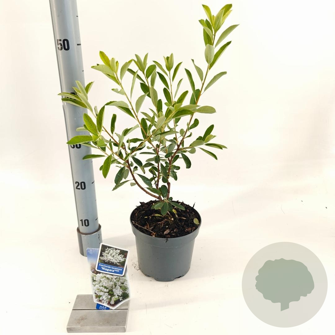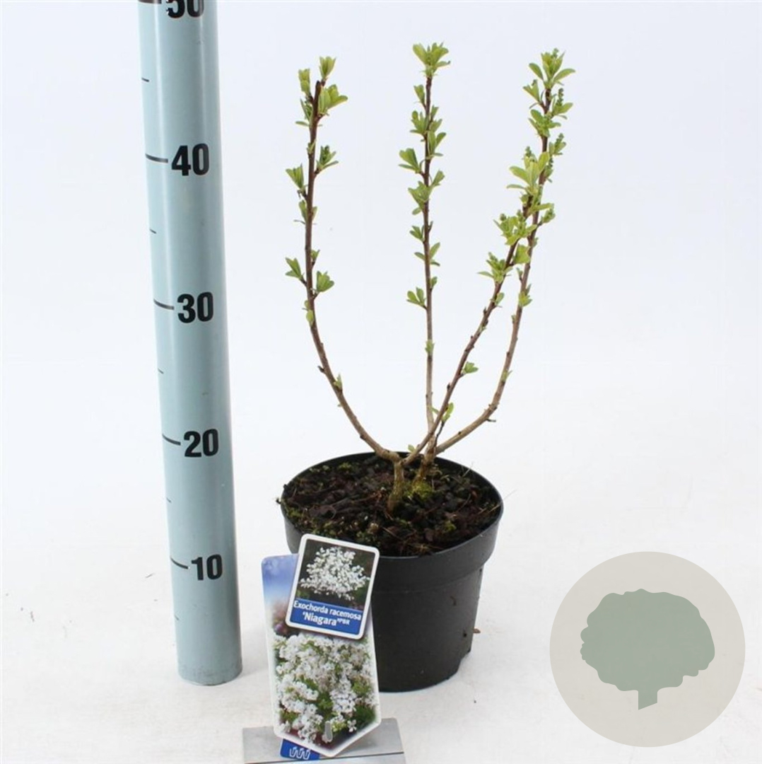 | Toelichting | De Parelstruik (Exochorda racemosa 'Niagara') is een prachtige struik met witte bloemen in het voorjaar. Deze struik bereikt een hoogte van 200 cm en gedijt goed in zon en halfschaduw op neutrale, goede tuingrond met humus. |