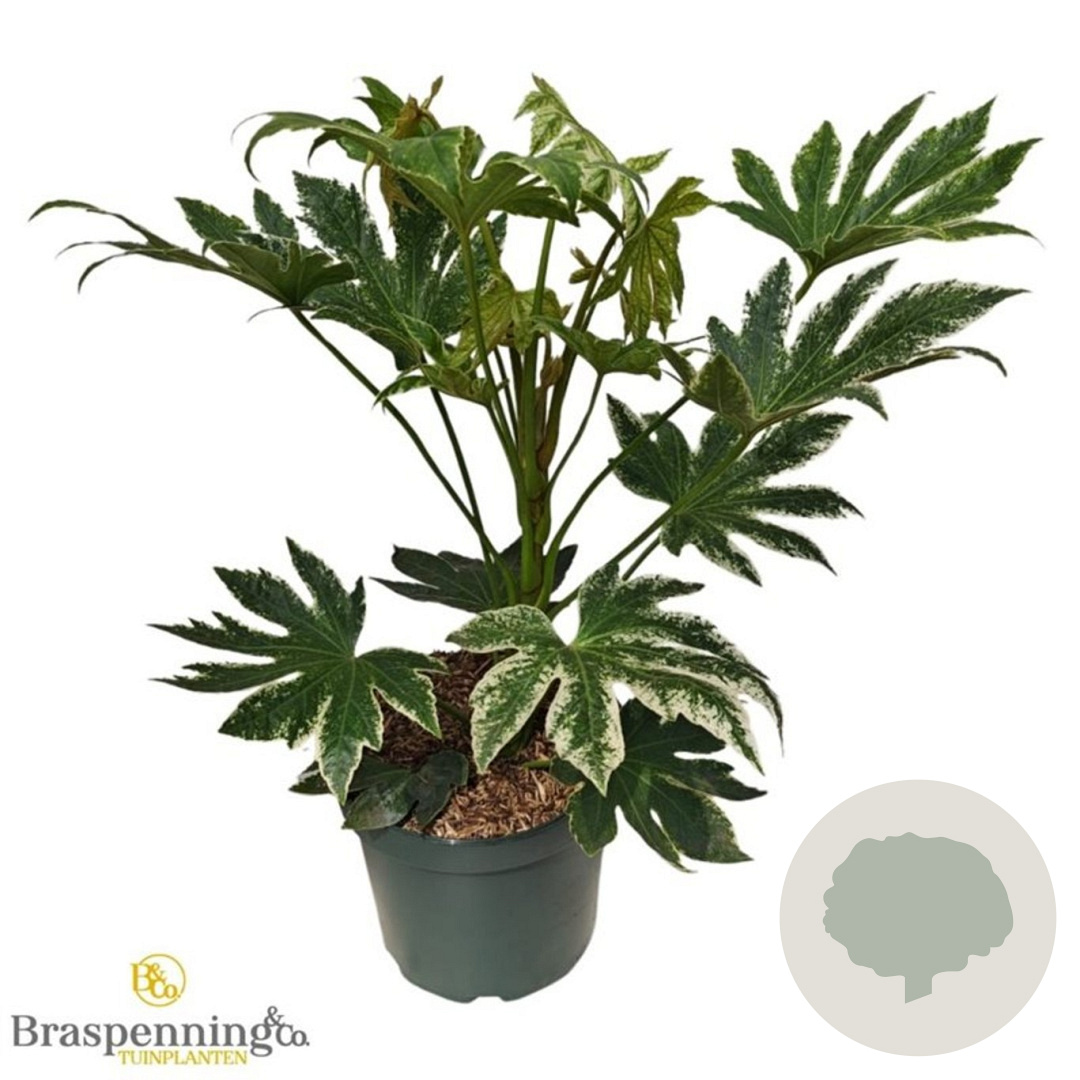 | Toelichting | De Vingerplant (Fatsia japonica 'Spider's Web') is een prachtige bladplant met groen/wit gevlekt blad. In de herfst bloeit deze plant met witte bloemen. Ideaal voor een plekje in de halfschaduw op humusrijke grond. |
