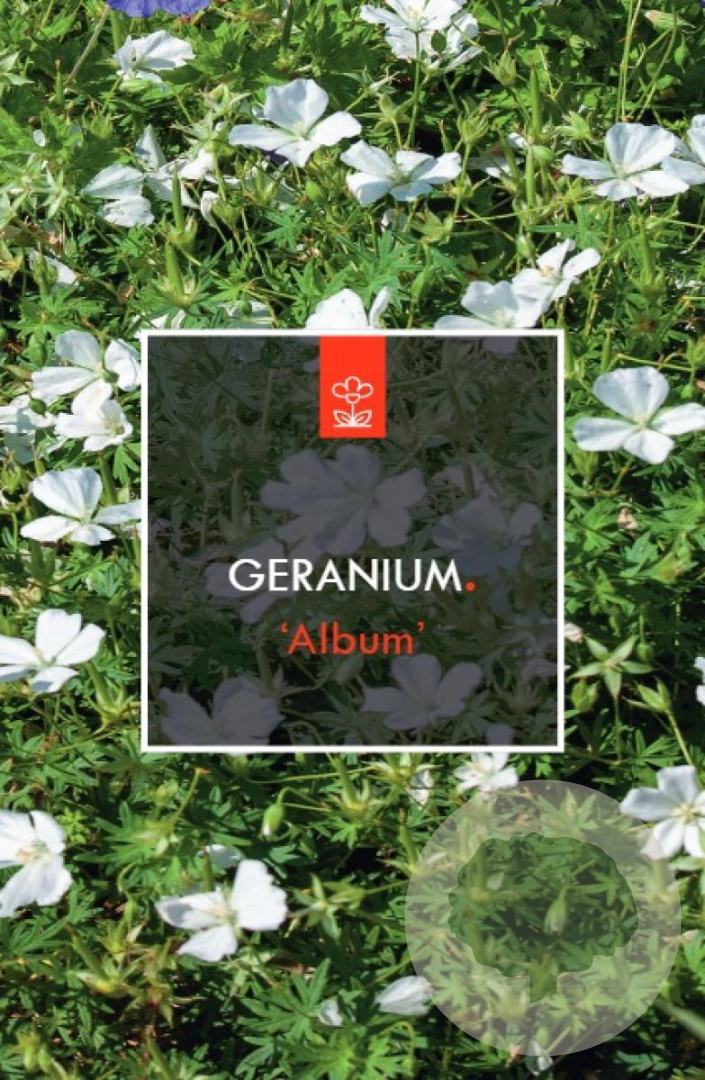 | Toelichting | De Ooievaarsbek (Geranium sang. 'Album') is een prachtige vaste plant met witte bloemen en groen blad. Deze plant bloeit van mei tot augustus en gedijt goed in zon en halfschaduw op lichte klei, neutrale grond of goede tuingrond. |
