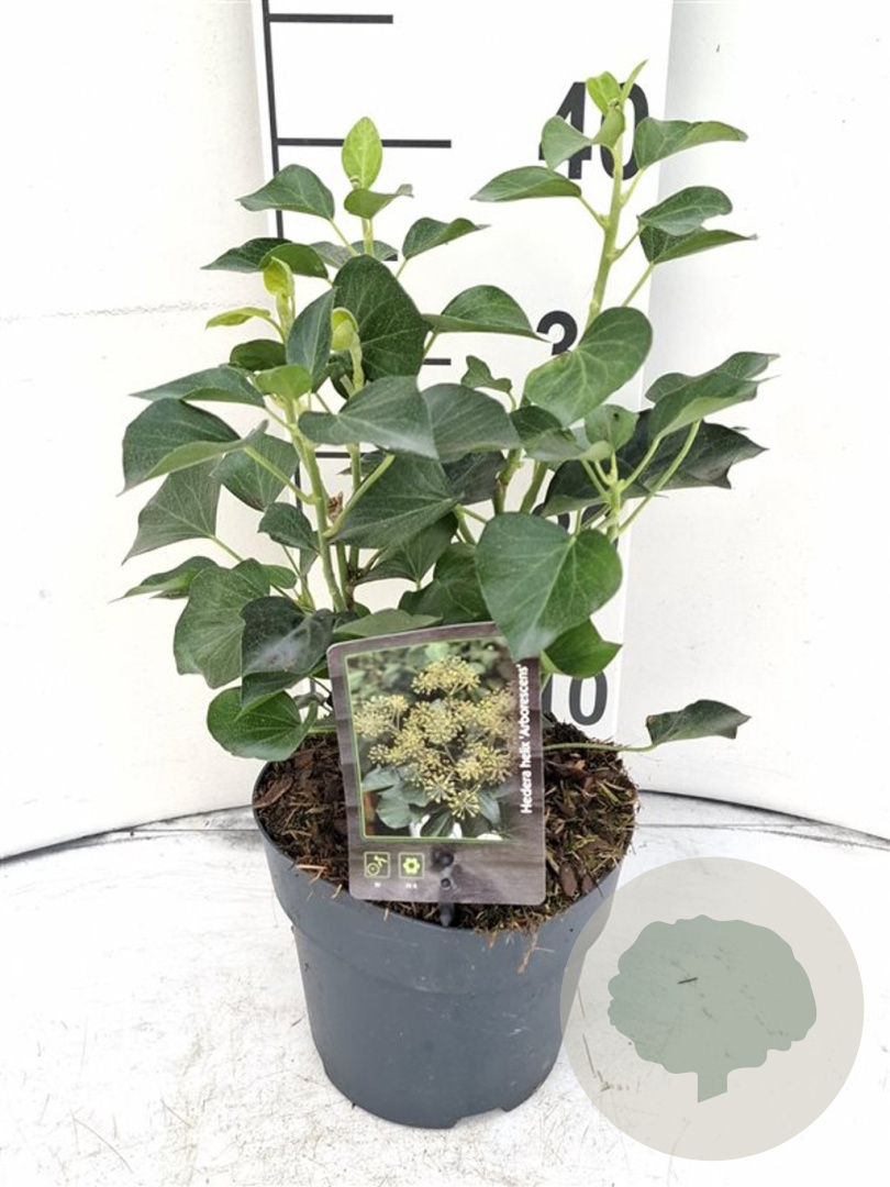 | Toelichting | De Klimop (Hedera hel. 'Arborescens') is een veelzijdige klimplant met donkergroene bladeren die zowel in de zon, halfschaduw als schaduw gedijt. Met een volwassen hoogte van 300 cm en groene bloemen in de herfst, is het een ideale plant voor diverse grondsoorten. |