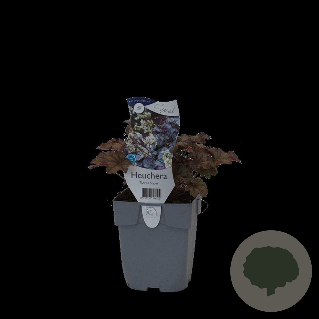 | Toelichting | Heuchera 'Flores Snow', ook bekend als Purperklokje, is een prachtige vaste plant met witte bloemen en groen blad. Deze plant bloeit van juni tot augustus en gedijt goed in de halfschaduw op neutrale tot humusrijke grond. Ideaal voor een kleurrijke tuinborder! |